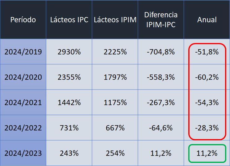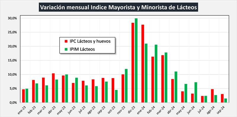 El índice mayorista de precios de los Lácteos registró un aumento de 1,5% en septiembre de 2024 respecto del mes anterior, se incrementó un 132,8% en los primeros 9 meses del año y la comparación anual con septiembre de 2023 arrojó un incremento del 254,0%, marcando en los lácteos un incremento interanual bastante superior al índice general y a la categoría de alimentos en los que se los incluye.