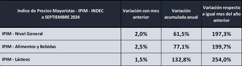 Índice de Precios Internos Mayoristas – IPIM – Lácteos – septiembre 2024 18/10/2024