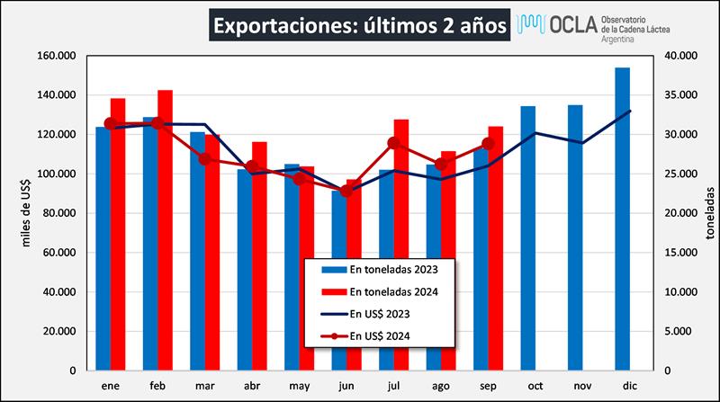 Las exportaciones de productos lácteos en septiembre de 2024 totalizaron 31.019 toneladas de productos, por un valor de US$ 115,2 millones, subieron 11,3%, y 9,9% en volumen de productos, y en monto total en dólares, respectivamente, comparadas con el mes anterior.