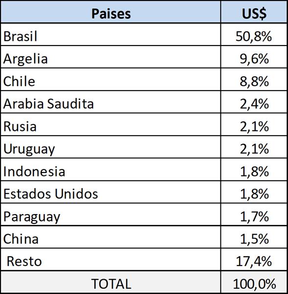 El destino de las exportaciones (en función al monto en dólares) se conformó: