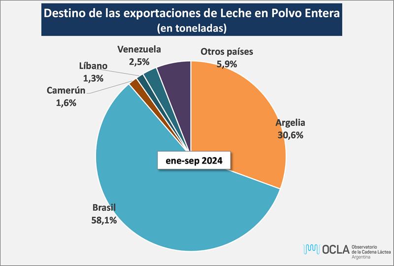 En ene-sep se da una participación algo superior de Brasil a lo habitual en las exportaciones de leche en polvo entera (58,1%) y con Argelia en segundo lugar con el 30,6%.
