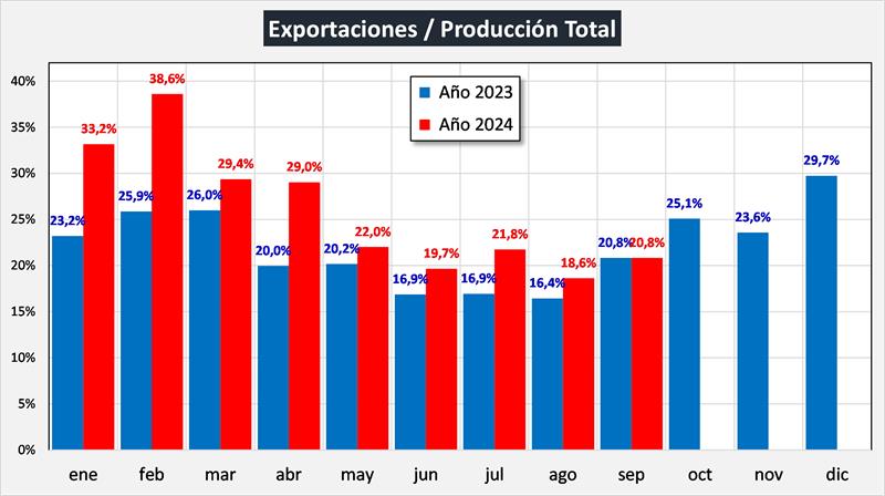 En litros de leche equivalentes (enero-septiembre 2024), las exportaciones crecieron el 11,4% y representaron el 25,2% de la producción total (en el período enero-septiembre de 2023 representaron el 20,5%). En particular, en septiembre de 2024 las exportaciones tuvieron una participación del 20,8% sobre la producción total del mes, lo cual implica un fuerte descenso en la participación respecto al primer cuatrimestre del año donde superaron el 30%.