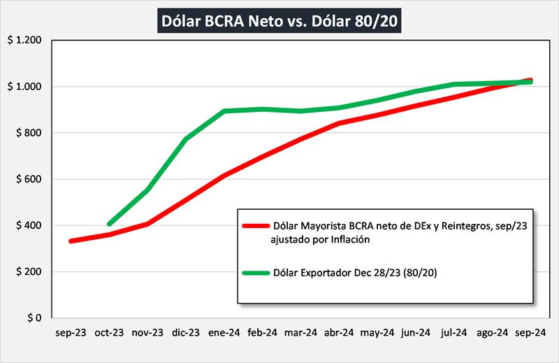 El tipo de cambio para las exportaciones, luego de la fuerte devaluación en diciembre 2023, se viene ajustando a un ritmo muchísimo más lento que la inflación (crawling peg del 2% mensual). Esta situación hace que se perdieran todas las ventajas competitivas del tipo de cambio (devaluación, dólar especial de exportación 80/20, brecha cambiaria mayorista BCRA y Contado con Liquidación y eliminación de derechos de exportación) y volvamos a tener el mismo tipo de cambio efectivo que teníamos antes de todas estas medidas (sep/23). Por lo tanto, los precios internacionales actuales, competitivos por cierto, generan un poder de compra de leche al productor, inferior al precio actual de la misma.