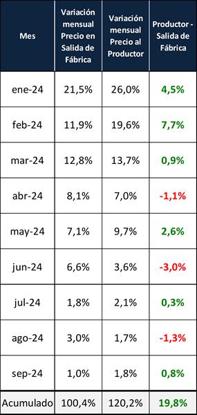 Variación del Valor de Salida Fábrica y del Precio al Productor – septiembre 2024 29/10/2024Este análisis trata de determinar la variación de precios de la industria y de la producción primaria. Se valoriza el ingreso de la industria en base a la proporción de leche que se destina a cada mercado y a los precios en que vende en cada uno de ellos. Para los precios de mercado interno se toma el Índice de Precios Mayoristas de los Lácteos de INDEC y para el mercado externo los precios en US$/ton., valorizados al tipo de cambio neto de exportación, en el caso del año anterior el Dólar Mayorista BCRA neto de Derechos de Exportación y de Reintegros y para este año el Dólar del Decreto 28/23 (80% dólar mayorista BCRA y 20% dólar contado con liquidación). ![]() Se puede ver en el cuadro que el precio de la industria subió respecto al mes anterior un 1,0% y el precio SIGLeA promedio al productor lo hizo un 1,8%. Cabe aclarar que el precio al Productor no incluye los ajustes posteriores a la liquidación ni los diferencias fuera de la facturación. Por otra parte, en el análisis interanual la variación de precios de la industria estuvo 15,5 puntos por debajo de la variación de precio al productor (244,6% respecto a 260,1%). Y en lo que va del año 2024 se puede ver en el siguiente cuadro la variación mensual y acumulada del Valor de Salida de Fábrica y del precio SIGLeA. ![]() elaborado por el OCLA con datos de la DNL-Secretaría de Bioeconomía, INDEC y BCRA