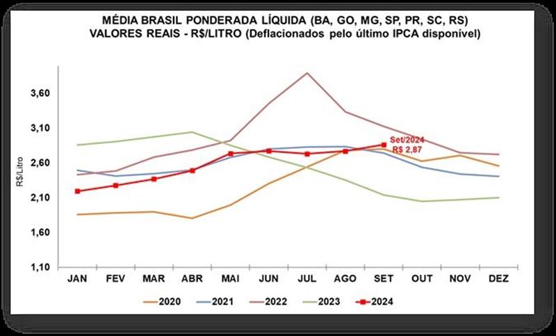 Como esperaban los agentes del sector, el precio de la leche recolectada en septiembre siguió aumentando. Una investigación del Cepea (Centro de Estudios Avanzados en Economía Aplicada), de la Esalq/USP, muestra que, en septiembre, el “Promedio Brasil” cerró en R$ 2,8657/litro (US$ 0,517/litro), un 3,3% más que el mes anterior y un 33,8% más que el registrado en septiembre/23, en términos reales (valores deflactados por el IPCA de septiembre).