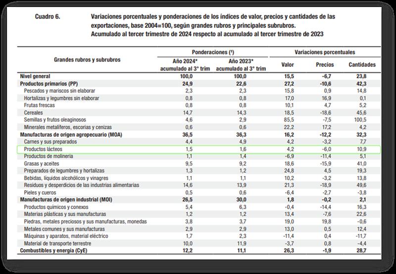 En las Manufacturas de Origen Agropecuario, los aumentos en las cantidades de residuos y desperdicios de las industrias alimentarias, especialmente harina y pellets de la extracción del aceite de soja (75,1%) tuvieron una gran ponderación en el índice. En grasas y aceites, se destacaron los aumentos en aceite de soja en bruto, incluso desgomado (91,3%), aceite de girasol (6,8%) y aceite de maní (46,8%), mientras que el aceite de oliva mostró una disminución (-16,5%). También contribuyeron al aumento las carnes y sus preparados, como la carne bovina fresca, refrigerada o congelada (7,3%) y la carne de ave (8,6%). En menor medida, crecieron los volúmenes de exportación de preparaciones de legumbres y hortalizas, como jugos de frutas y hortalizas (56,3%) y aceitunas (6,9%); así como productos lácteos, con aumentos en leches preparadas (5,8%), quesos (23,6%) y manteca (11,7%). Las bebidas, líquidos alcohólicos y vinagres también mostraron un incremento, principalmente el vino de uva (26,9%). Otros rubros relevantes fueron los productos de la molinería (6,4%) y las pieles y cueros, que registraron una disminución (-9,0%).