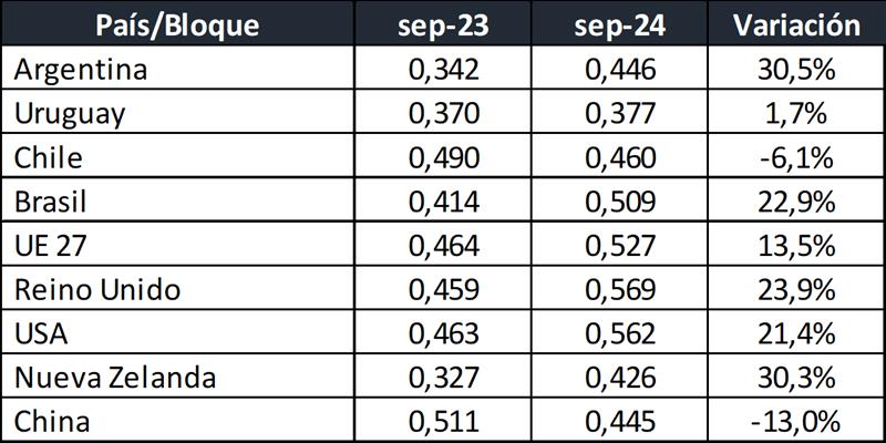 Fuentes: DNL-MAGyP, INALE, ODEPA, CEPEA/ESALQ USP, EMMO, AHDB, USDA y CLAL, respectivamente.