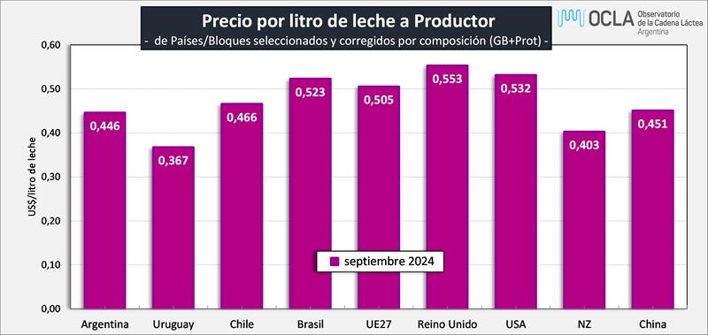 Observaciones: los precios en el gráfico de arriba han sido corregidos sólo por sólidos útiles (grasa butirosa y proteína) y no por el resto de atributos que hacen a la calidad higiénica y sanitaria, ni tampoco por tipo de cambio real bilateral con cada uno de esos países/bloques.