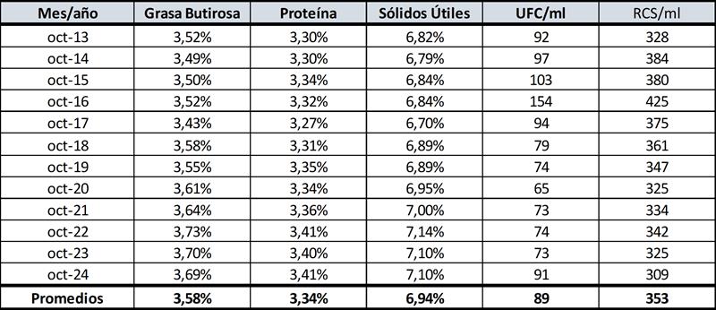 Evolución de la Calidad de Leche: mes de octubre últimos 12 años