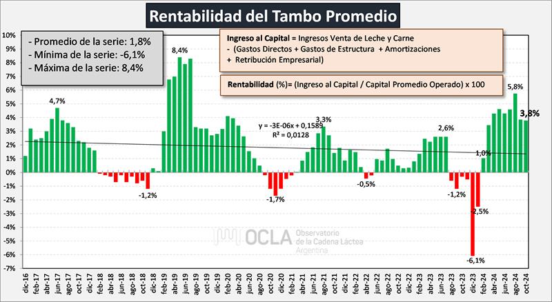 Como lo veníamos informando en oportunidades anteriores se había producido un fuerte desacople en diciembre 2023 (por la devaluación y la alta inflación), entre precios y costos y señalábamos que los precios de la leche venían creciendo por encima de la inflación y que pronto se produciría la convergencia, es por ello que ya en febrero se puede observar una tasa de rentabilidad positiva que se acentúa entre marzo y mayo, que en junio pasado cae levemente por un menor incremento del precio que el de los costos y retoma un valor igual a mayo en julio próximo pasado y en agosto alcanza el 5,8% que luego cae en septiembre y octubre a valores algo por encima del 3% de rentabilidad . Se puede decir que en el período abril-octubre de 2024 se logra el precio de equilibrio si se adicionan los diferenciales de precio que se generan con las notas de crédito post liquidación.