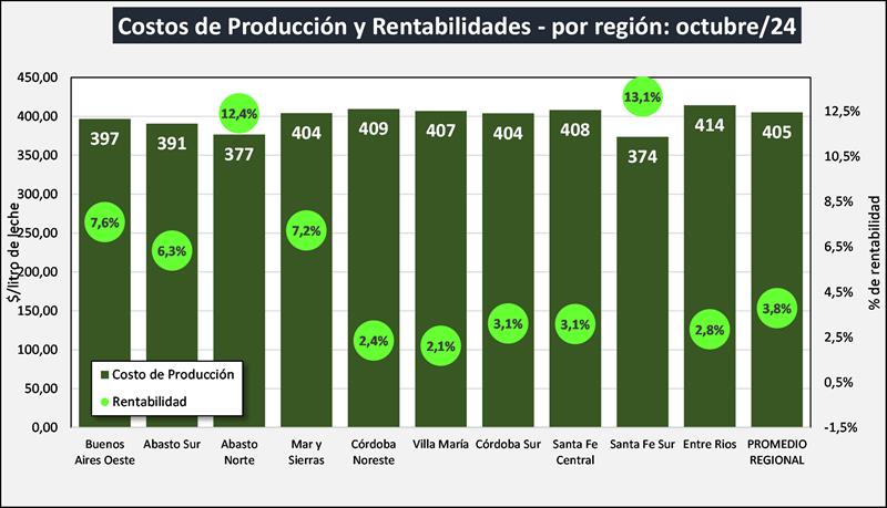El Costo de Producción Promedio de $ 405,01/lt. y la Rentabilidad Promedio de 3,8%, surgen de los promedios ponderados de las 10 regiones mencionadas y para los tres estratos considerados. En el gráfico de abajo se puede observar el costo y la rentabilidad de cada región productiva, mostrando claramente la gran dispersión, muy vinculada con las diferentes escalas y productividades.