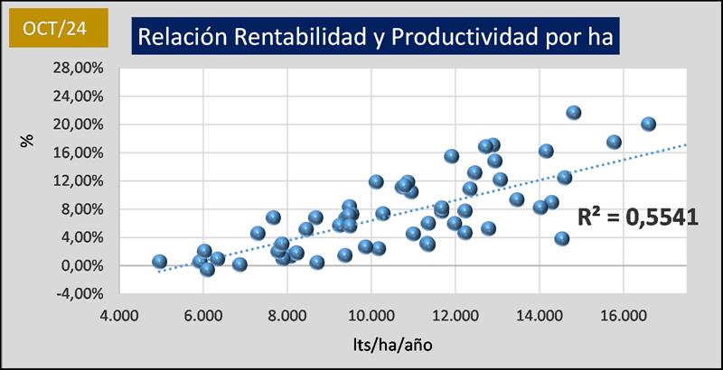 Por último, incorporamos el gráfico donde se obtiene la mayor correlación entre las variables económicas y productivas, en este caso la relación entre la Productividad (medida en litros de leche por hectárea y por año) y la rentabilidad sobre el capital operado (Ingreso Neto/Capital x 100).