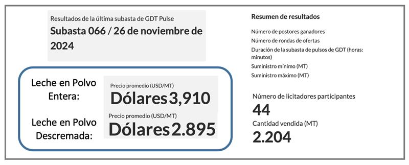 La subasta Nº 066 se ha llevado ha cabo en el día de hoy, martes 26 de noviembre, donde el precio promedio obtenido para la LPE ha sido de 3.910 /t, el cual representa una suba de 2,6% respecto a lo publicado en la última GDT pulse (3.811 US$/t) y de 2,2% respecto al último evento del GDT (3.826 US$/t).