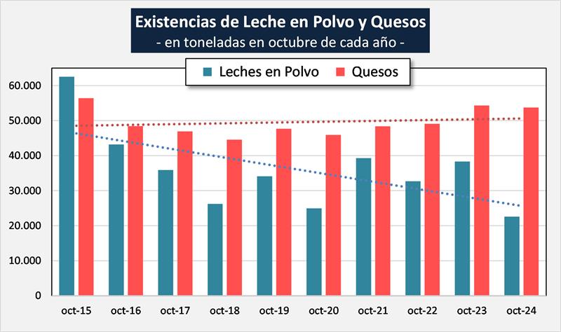 Evolución de las existencias de leches en polvo (enteras y descremadas) y quesos (duros, semiduros, blandos y muy blandos) a octubre de los últimos 10 años: