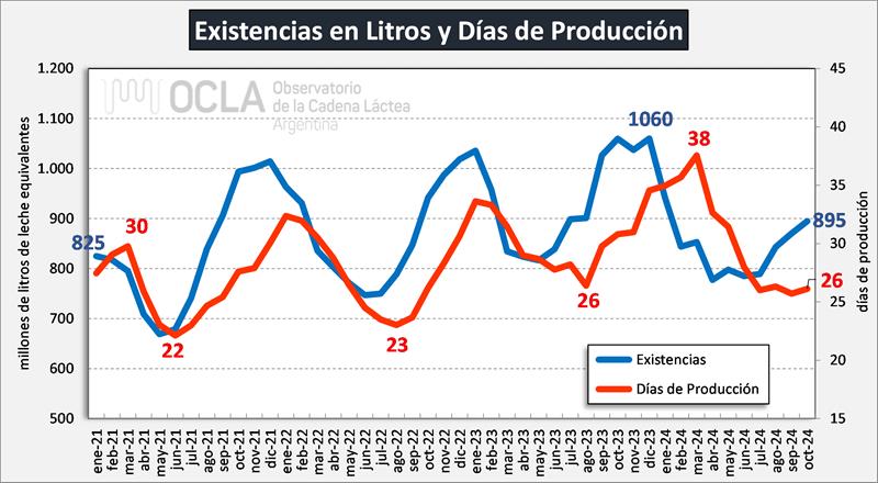 En el mes de octubre de 2024 las existencias fueron 4,2% superiores al mes anterior en volumen de productos y en litros de leche equivalentes estuvieron en 895 millones de litros de leche equivalentes, un 2,8% por encima de septiembre de 2024. Respecto al interanual, octubre 2024 estuvo -6,0% y -15,5% en volumen y litros de leche equivalentes respectivamente respecto de octubre de 2023.