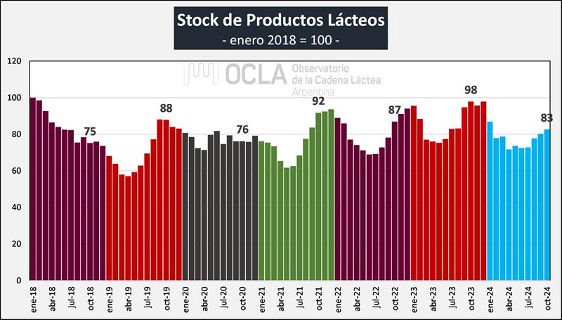 Al mes de octubre de 2024 los stocks iniciales del año 2024 cayeron un 10,2% en volumen de productos y 15,6% en litros de leche equivalentes.