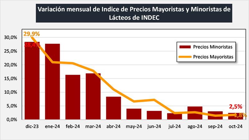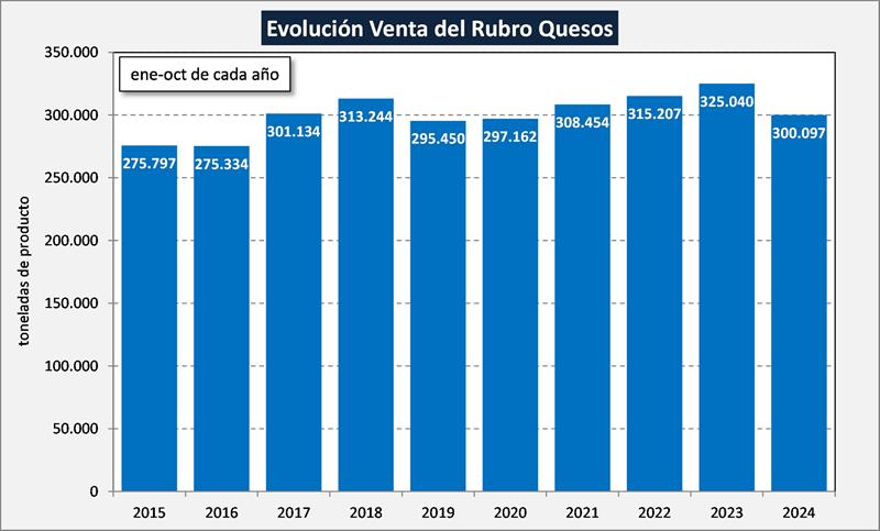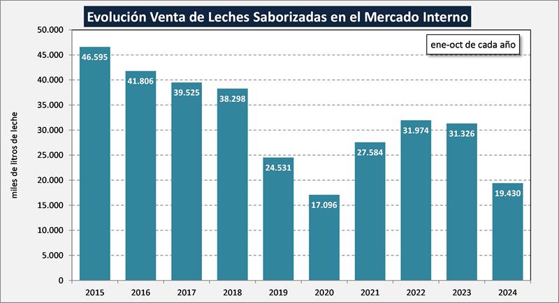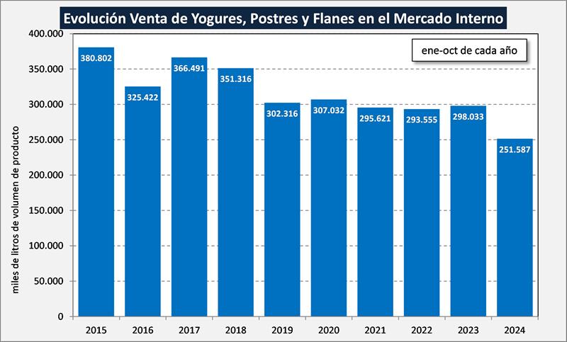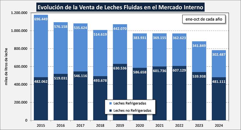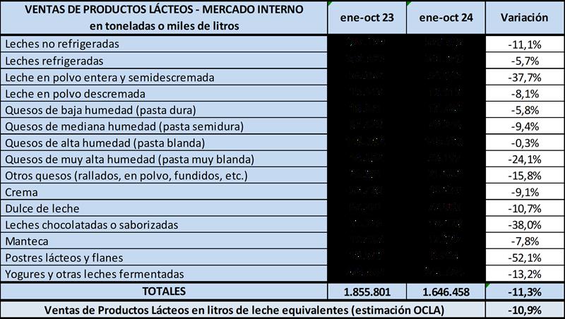 El acumulado del período enero-octubre del 2024 muestra en el cuadro de arriba una caída del 11,3% en volumen de productos y del 10,9% en litros de leche equivalentes (-11,2% en el promedio diario).