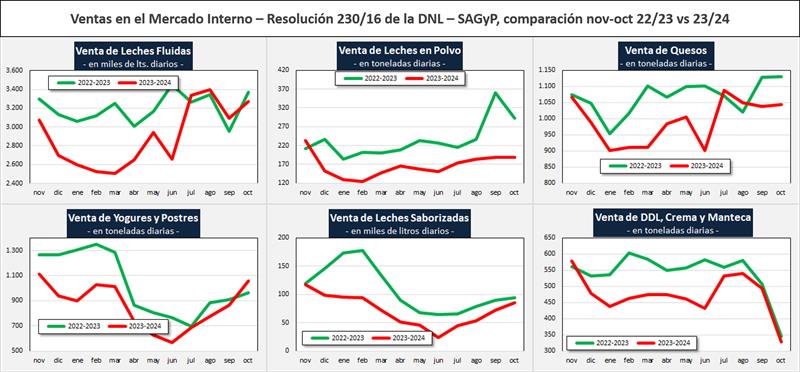Las ventas según la Resolución 230/16 de la DNL presentaron para el mes de octubre de 2024 un volumen 9,1% superior al mes pasado y en litros de leche equivalente un 4,5% mas alto en la comparación total mensual (+1,1% en el promedio diario).