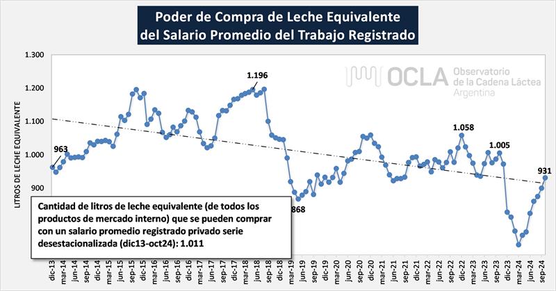 En el gráfico siguiente se utiliza el Valor del Litro de Leche Equivalente comercializado en el Mercado Interno y se lo compara con el Salario Registrado (OCLA estimó los dos últimos meses no disponibles del valor del salario). En los últimos meses se nota un incremento del poder adquisitivo del mismo medido en Litros de Leche Equivalentes (LLE).