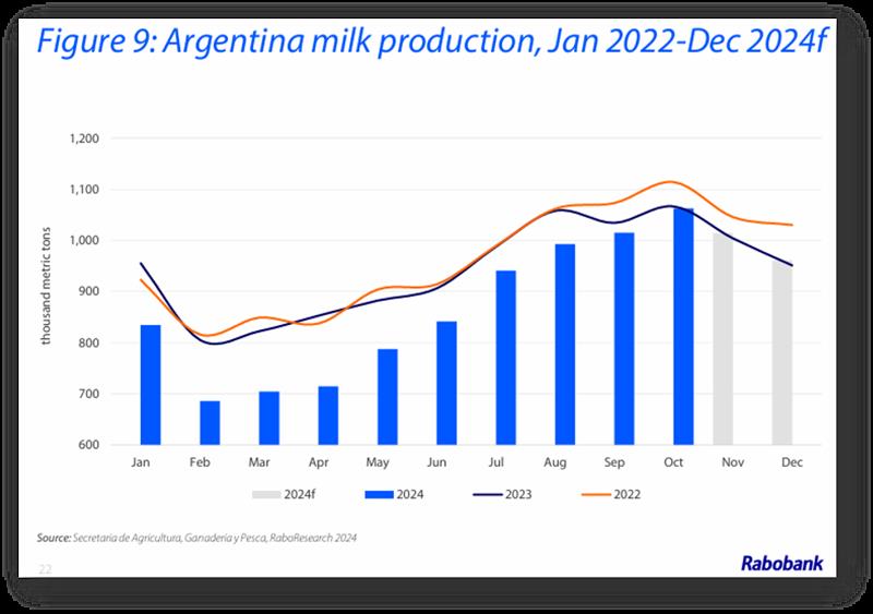 Sin embargo, el consumo interno de productos lácteos sigue siendo débil y se contraerá alrededor del 10% en 2024. Hay optimismo sobre una recuperación en 2025 y Rabobank anticipa un regreso al crecimiento. Esto estará impulsado por aumentos salariales y una inflación moderada, que respaldarán el poder adquisitivo perdido durante la fuerte depreciación de la moneda entre 2023 y principios de 2024.