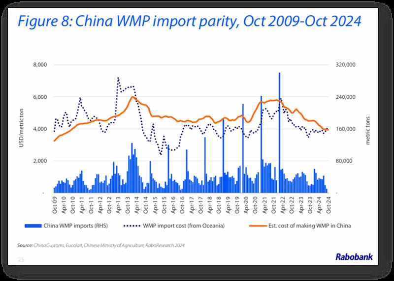 Rabobank espera que la producción de leche caiga un 1,5% interanual en 2025. La menor oferta y el optimismo sobre una recuperación de la demanda de los consumidores respaldarán un aumento marginal en los volúmenes de importación en 2025.