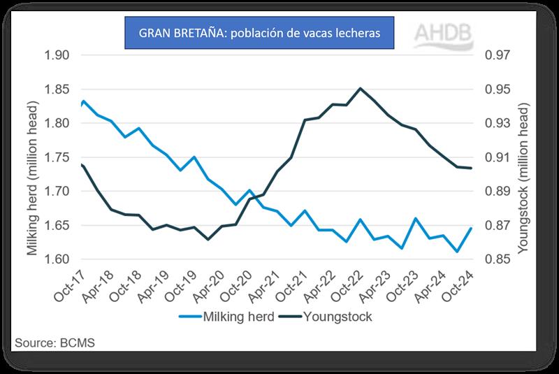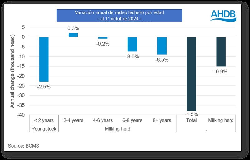 El rodeo lechero de Gran Bretaña ascendió a 1,64 millones de cabezas en octubre de 2024, la cifra más baja registrada en un mes de octubre, y una disminución del 0,9 % en comparación con el mismo mes del año anterior. Se observó una caída en todos los grupos de edad, con la excepción del grupo de edad de 2 a 4 años.