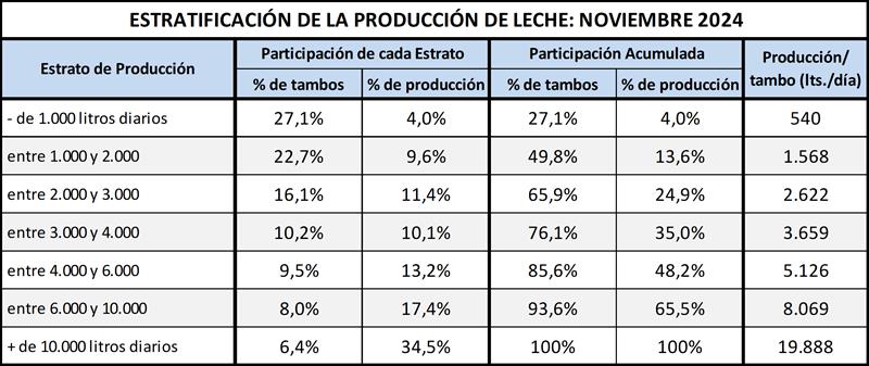 Puede verse en el cuadro siguiente al comparar con datos disponibles del año 2010, que en un extremo venía disminuyendo la participación tanto en cantidad de tambos como en el volumen de producción de las unidades productivas de menos de 2.000 litros diarios y en el otro extremo de la estratificación, se incrementa la participación de las unidades de más de 10.000 litros diarios, situación esta última, atemperada por la baja de producción en este último año.