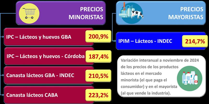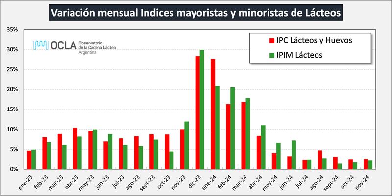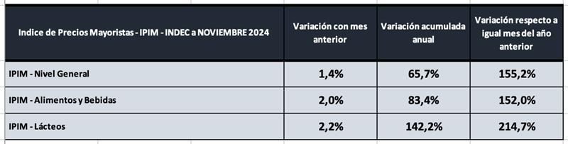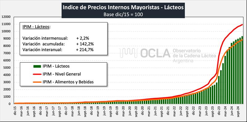 El índice mayorista de precios de los Lácteos registró un aumento de 2,2% en noviembre de 2024 respecto del mes anterior, se incrementó un 142,2% en los primeros 11 meses del año y la comparación anual con noviembre de 2023 arrojó un incremento del 214,7%, marcando en los lácteos un incremento interanual bastante superior al índice general y a la categoría de alimentos en los que se los incluye.