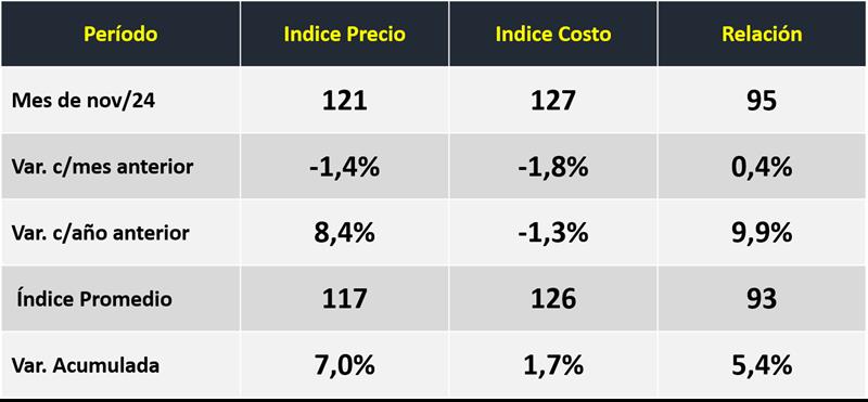 Se puede observar que la mejora del Indice Precio y la baja del Indice Costo en la variación interanual que venía hasta agosto, se revierte en septiembre. En octubre desmejora levemente el índice precio pero también baja levemente el índice costo, con los cual se mantiene prácticamente igual la relación (95) y en noviembre próximo pasado ocurre una situación similar. En el interanual la suba del 8,4% del índice se contrapone a una baja del 1,3% índice costo, lo cual potencia la mejora a un 9,9% en la relación. En el acumulado del año el Indice Precio sube 7,0% y sube también el Indice Costo pero muy por debajo, un 1,7%, lo cual permite que la Relación Precio/Costo mejore en los 11 meses transcurridos del 2024 un 5,4% respecto a igual período del año anterior.