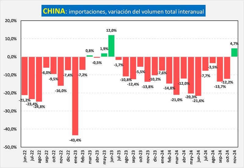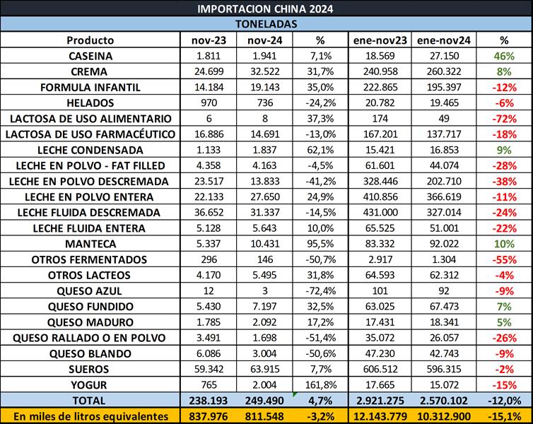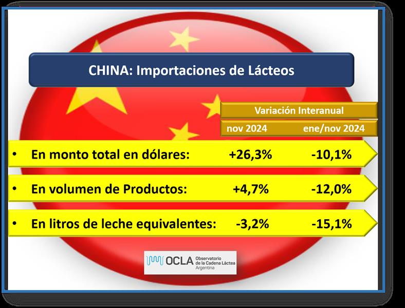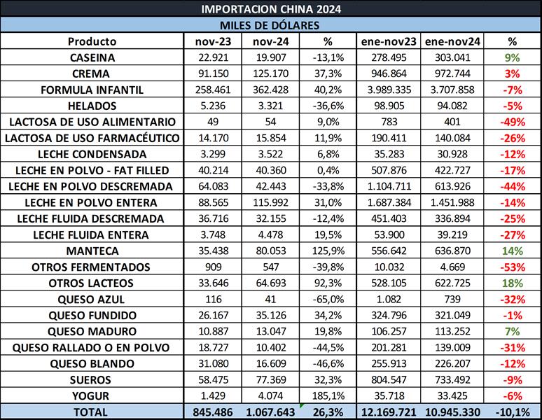 CHINA: importaciones de productos lácteos a enero-noviembre de 2024 24/12/2024