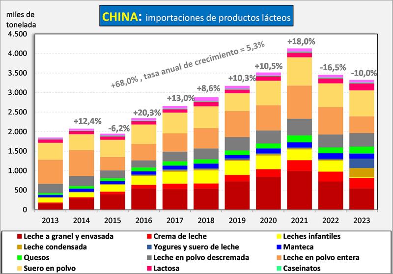 Las importaciones de productos lácteos de China venían creciendo significativamente entre 2013-2021 (salvo en la crisis de 2015) a una tasa acumulativa del 10,6% anual, con la caída del 16,5% en 2022 y del 10,0% en 2023, la tasa se redujo al 5,3% anual. De cualquier manera, sigue siendo China uno de los principales motores de la demanda de lácteos en el mercado internacional, punto este que algunos ponen en duda para el futuro.