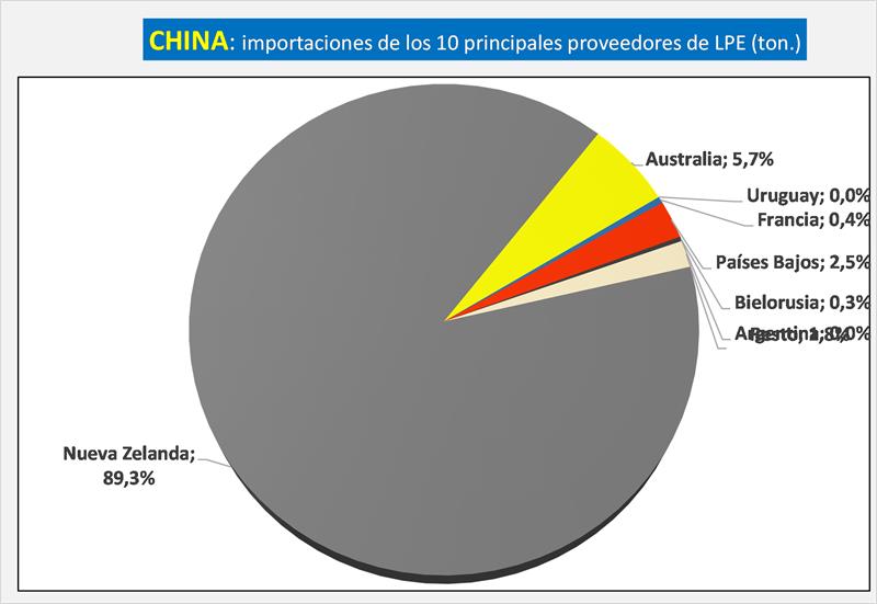 China es el principal importador de Leche en Polvo Entera y su principal proveedor es Nueva Zelanda quien ostentó el 89,3% de participación de ese producto en el gigante asiático en lo que va de 2024, muy similar a la participación del 2023 que fue del 88,3% para igual período.