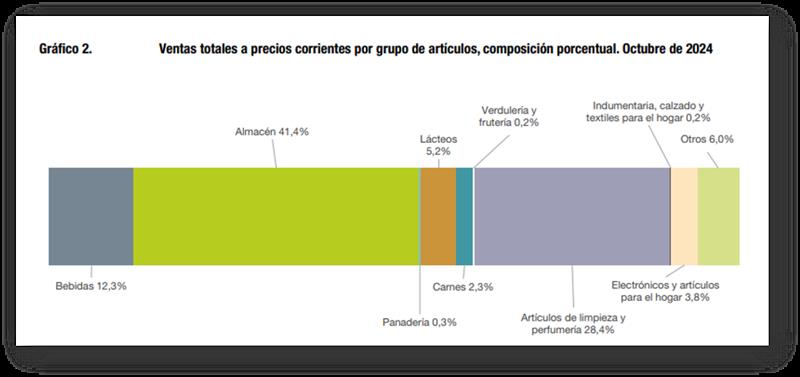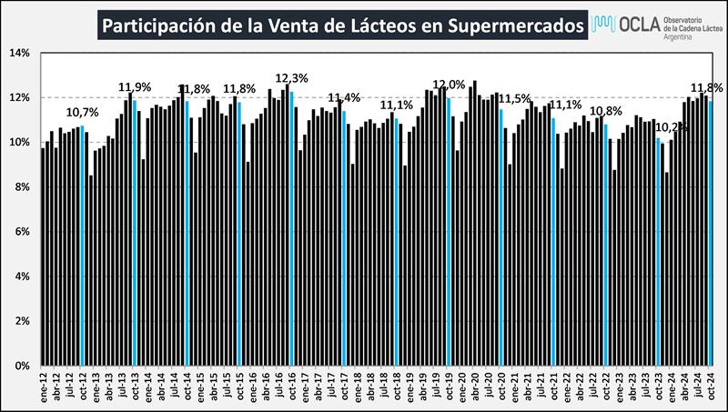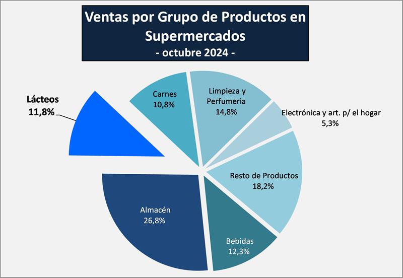 En octubre de 2024 las ventas de lácteos en autoservicios mayoristas fueron de $ 15.806,6 millones sobre una venta total de $ 306.010 millones, lo que determina una participación del 5,2%.