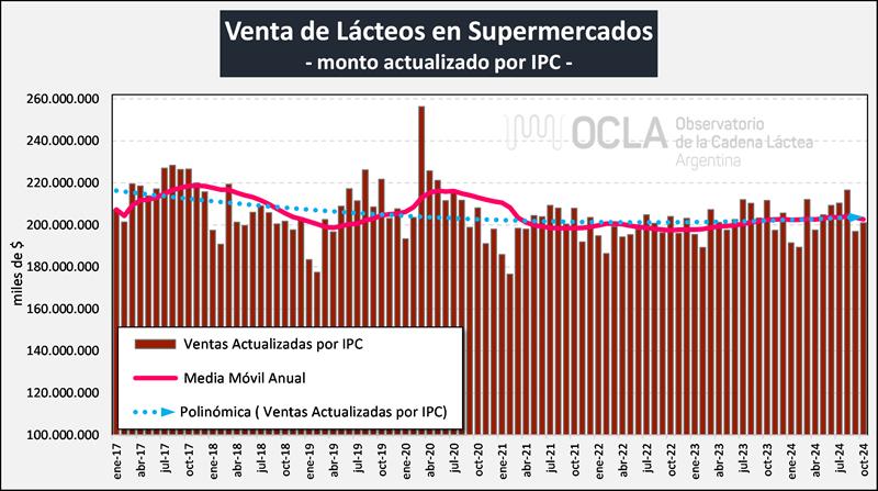 En el mes de octubre de 2024 las ventas de lácteos en supermercados fueron de $ 201.001 millones, +1,4% respecto al mes anterior en promedio diario, y +179,3,0% respecto a igual mes del año 2023 (13,7 puntos por debajo del IPC) y -0,3% en el acumulado de los once meses, respecto a los 11 primeros meses del año anterior en moneda constante.