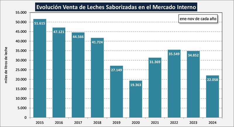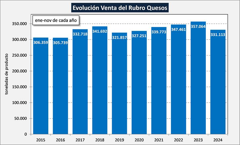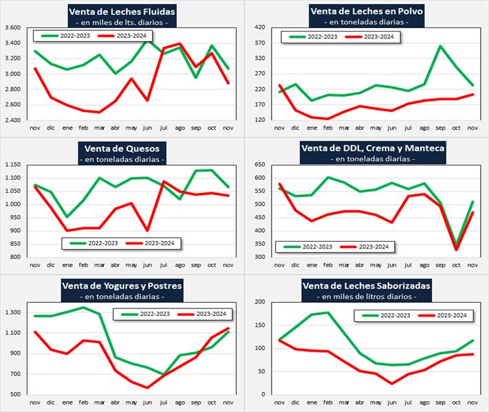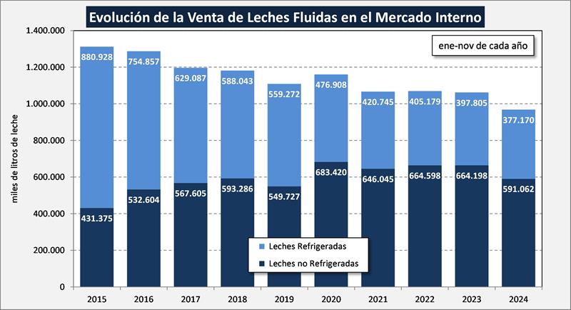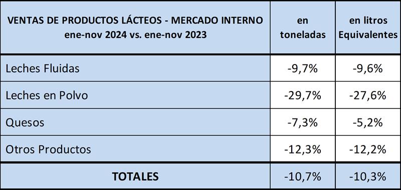 El acumulado del período enero-noviembre del 2024 muestra en el cuadro de arriba una caída del 10,7% en volumen de productos y del 10,3% en litros de leche equivalentes (-10,6% en el promedio diario).