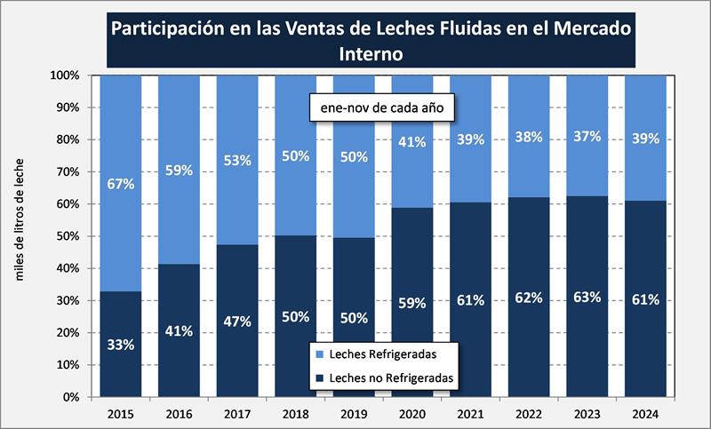 En los dos gráficos siguientes se presentan las ventas de leche fluida (en miles de litros), a noviembre de cada año (refrigeradas y no refrigeradas), donde se puede ver por un lado el descenso en el total de leches fluidas (al menos las que captura la Resolución 230) que se viene dando en los últimos 9 años. Por otra parte, en el gráfico que le sigue a éste, se evidencia claramente cómo fueron creciendo en participación las leches no refrigeradas en detrimento de las leches refrigeradas, pero en estos últimos meses hubo una reversión a ese proceso, volviendo a recuperar algo de terreno las leches refrigeradas.