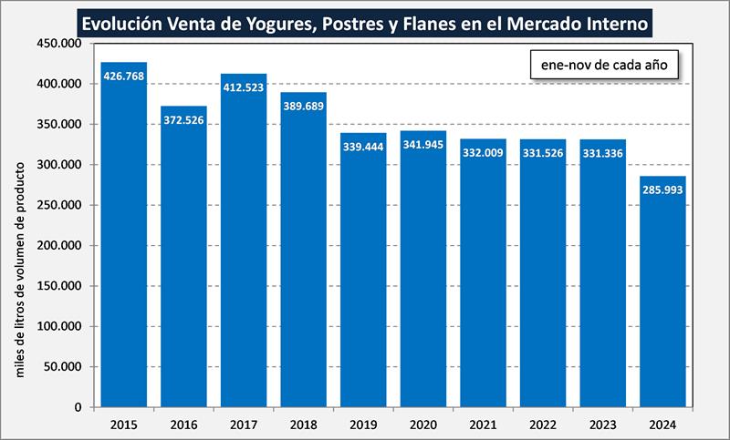 El Balance Lácteo que dispone de los valores de producción, existencias, importaciones y exportaciones de información oficial, calcula por diferencia el consumo. Para el período enero-noviembre del 2024 determinó una caída de consumo doméstico total del 10,3% idéntica a los datos que arroja la Resolución 230 (-10,3%).