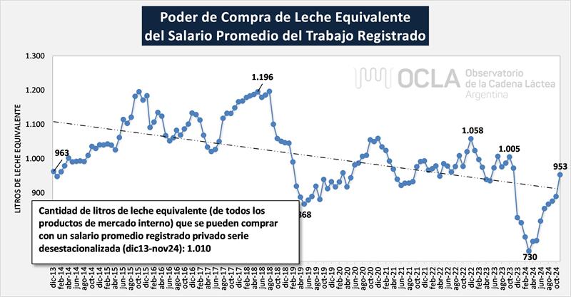 En el gráfico siguiente se utiliza el Valor del Litro de Leche Equivalente comercializado en el Mercado Interno y se lo compara con el Salario Registrado (OCLA estimó el último mes no disponibles del valor del salario). En los últimos meses se nota un incremento del poder adquisitivo del mismo medido en Litros de Leche Equivalentes (LLE).