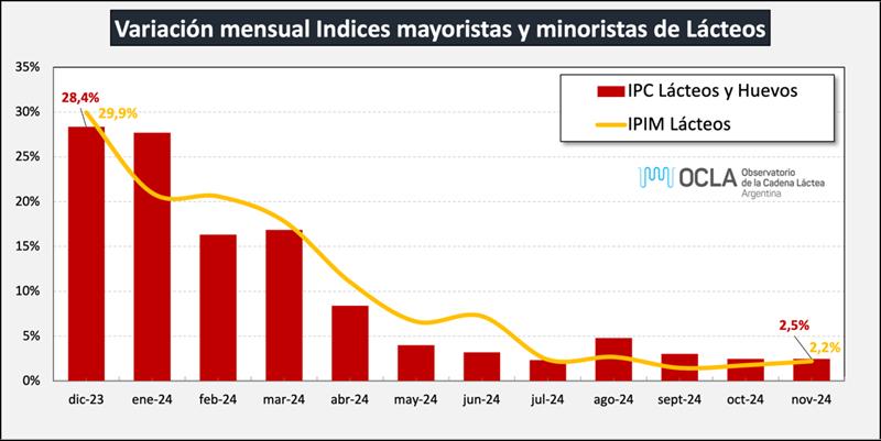 La comparación interanual (nov/24 vs nov/23) indicó una disminución en volumen del 4,7% y una baja del 4,3% en litros de leche equivalentes, marcando una importante desaceleración en la caída interanual del primer semestre.