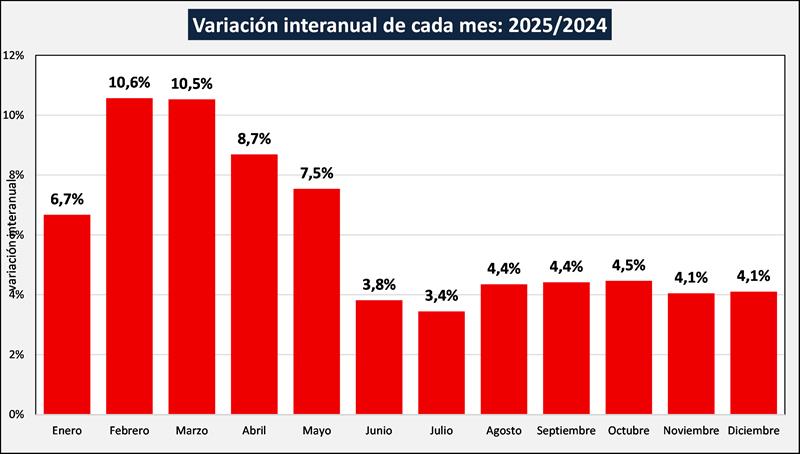 Se les solicitó a unas 22 industrias, que nos brinden su estimación para la producción 2025 respecto a 2024. Los datos aportados corresponden a la variación interanual a tambo constante de cada mes de 2025 respecto a igual mes del año anterior y la variación total anual.