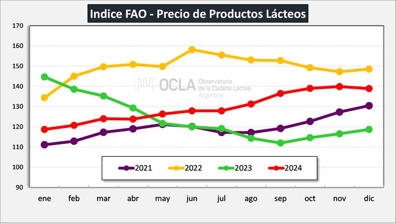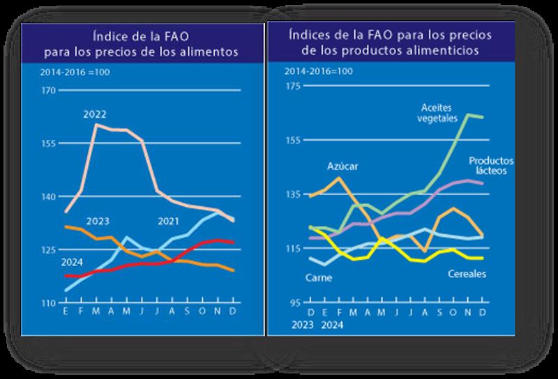 El índice de precios de los productos lácteos de la FAO se situó en diciembre en un promedio de 138,9 puntos, es decir, 1,0 puntos (un 0,7 %) menos que en noviembre, lo que representa el primer descenso tras siete meses consecutivos de aumento, aunque se mantuvo 20,2 puntos (un 17,0 %) por encima del nivel alcanzado un año antes. Las cotizaciones internacionales de la manteca registraron el mayor descenso, poniendo fin a una racha de 14 meses de aumento continuo, debido a la atonía de la demanda mundial y a las reservas acumuladas. Del mismo modo, se contrajeron los precios mundiales del queso y la leche en polvo descremada, impulsados por una mayor debilidad de la demanda internacional. Por el contrario, las cotizaciones internacionales de la leche en polvo entera experimentaron una subida repentina, como resultado del aumento de los precios en Oceanía derivado de la sólida demanda mundial, especialmente en Asia, en combinación con una mayor escasez de las existencias en Europa occidental debido al descenso estacional de la producción lechera. En lo que respecta a 2024 en su conjunto, el índice de precios de los productos lácteos de la FAO alcanzó un promedio de 129,6 puntos, lo que supone un aumento de 5,8 puntos (un 4,7 %) respecto de 2023. Este incremento se atribuyó principalmente a un acusado aumento repentino de los precios de la manteca, como consecuencia de la elevada demanda mundial y la limitación de la oferta destinada a la exportación, a raíz de la irregularidad de los patrones meteorológicos que afectó negativamente a la producción.