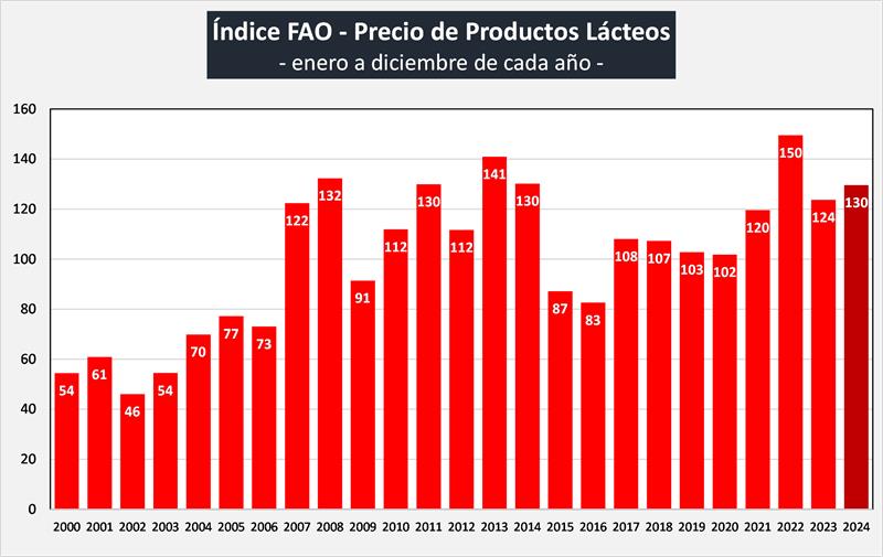 Por su parte el gráfico siguiente muestra el valor promedio de cada año del índice de precios de los lácteos de FAO de los últimos 25 años (2000-2024):