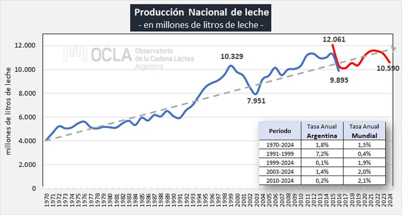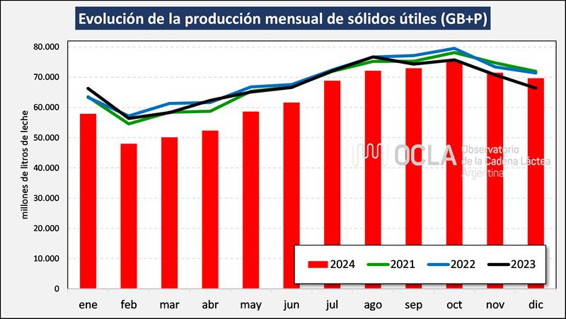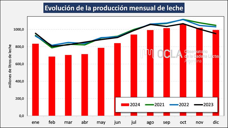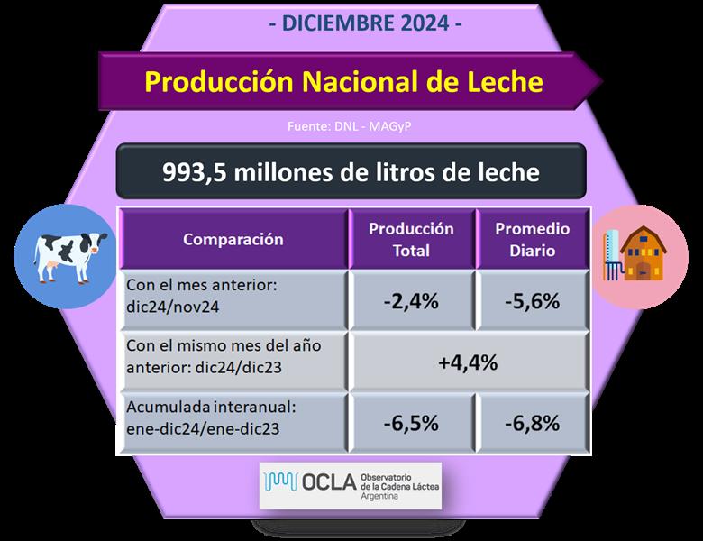 En el mes de diciembre del 2024 la producción fue de 993.509.504 litros de leche, esto implica un valor 2,4% por debajo del mes anterior (-5,6% en el promedio diario) y un 4,4% más que igual mes del año anterior.