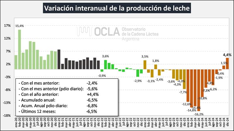 Si se analiza por tamaño de tambos, por niveles de productividad/eficiencia y por región geográfica, se evidencia una gran diferencia respecto al comportamiento de la producción, donde hay variaciones interanuales muy dispares en las diferentes regiones y estratos productivos. Ya los meses de noviembre y diciembre ingresaron en el cuadrante positivo, Para 2025 se espera una mejora en torno al 5,7% anual (+6,0% en el promedio diario), ver estimación: https://www.ocla.org.ar/noticias/32196164