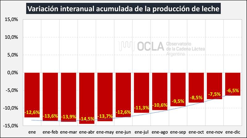 La producción total de leche de Argentina según los datos de la DNL llegó a 10.590.329.337 litros de leche, un 6,5% menos que el año 2023.