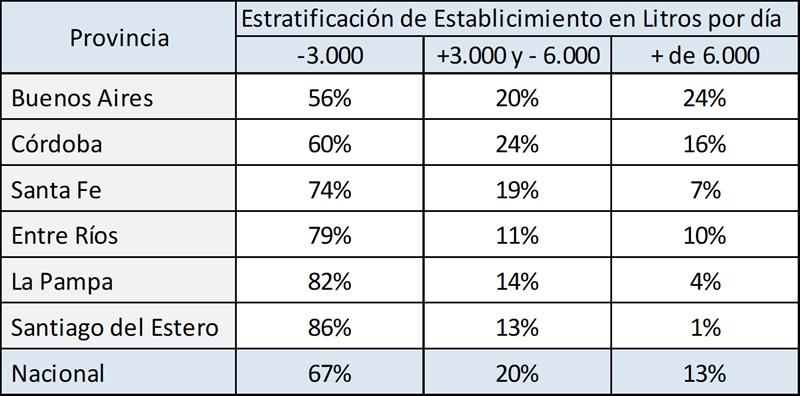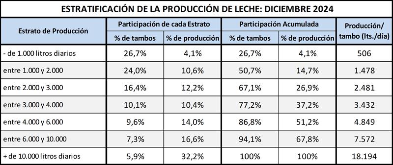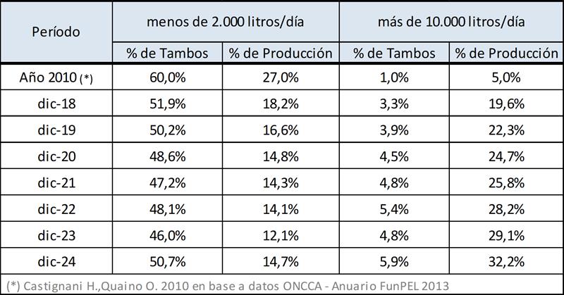 Puede verse en el cuadro siguiente al comparar con datos disponibles del año 2010, que en un extremo viene disminuyendo la participación tanto en cantidad de tambos como en el volumen de producción de las unidades productivas de menos de 2.000 litros diarios y en el otro extremo de la estratificación, se incrementa la participación de las unidades de más de 10.000 litros diarios, situación esta última, atemperada por la baja de producción en este último año.