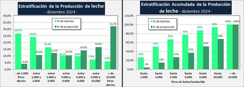 En el cuadro se presenta la participación de los tambos en función a su tamaño medido en litros de leche diarios del mes de diciembre de 2024 sobre la base SIGLeA - LUME: