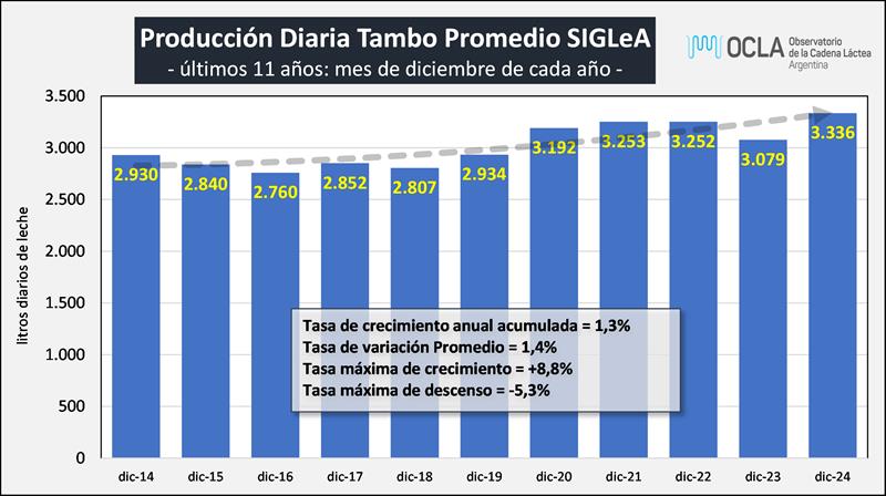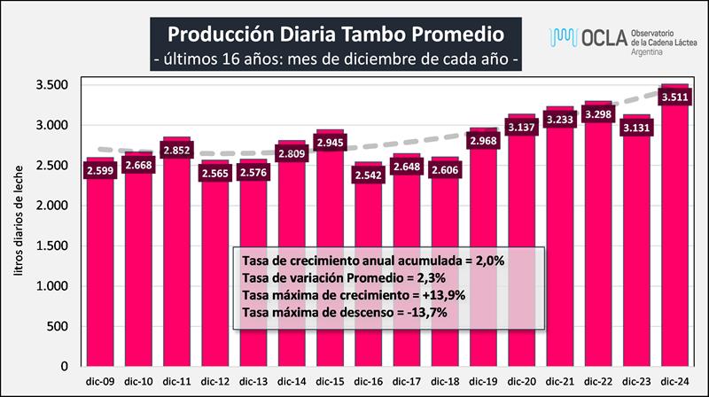 Sobre la base de la producción mensual y la cantidad de tambos que indica el Tablero Dinámico de SENASA, podemos inferir el tamaño del tambo promedio, unos 3.511 litros de leche diarios para noviembre de 2024, una producción superior al año anterior (+12,1%). Este valor surge por la combinación de 4,4% mas producción interanual en diciembre y por 7,4% menos unidades productivas registradas en el tablero. En el período 2016-2024 el tambo promedio creció a una tasa del 4,1% anual, situación que se ve interrumpida en 2018 y 2023 por diferentes factores.