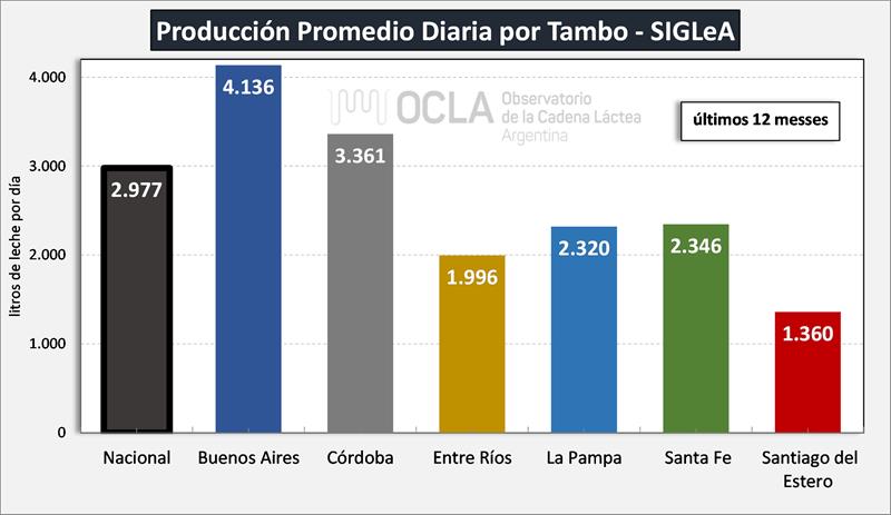 La producción promedio diaria por tambo y por provincia que graficamos aquí es la que arrojan los datos de SIGLeA – LUME y se toma el promedio de los últimos 12 meses (enero/24 – diciembre/24). Los datos SIGLeA – LUME del último mes provienen de 7.675 liquidaciones, 370 industrias lácteas.
