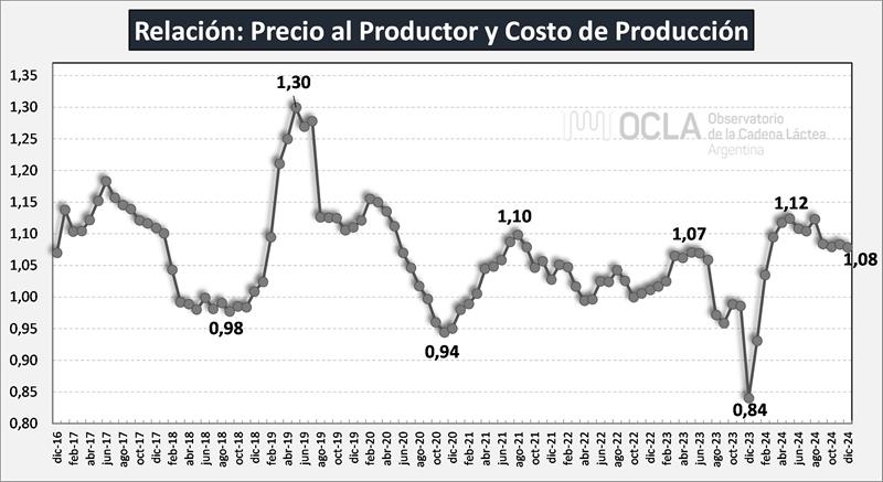 El gráfico siguiente muestra la relación entre el precio percibido y el costo de producción, que cuando el factor supera 1 el precio es superior al costo. Esta relación que llegó a 1,12 en mayo pasado, cae a 1,09 en noviembre, pero sostiene valores por encima de 1 para 11 de los 12 meses de 2024.